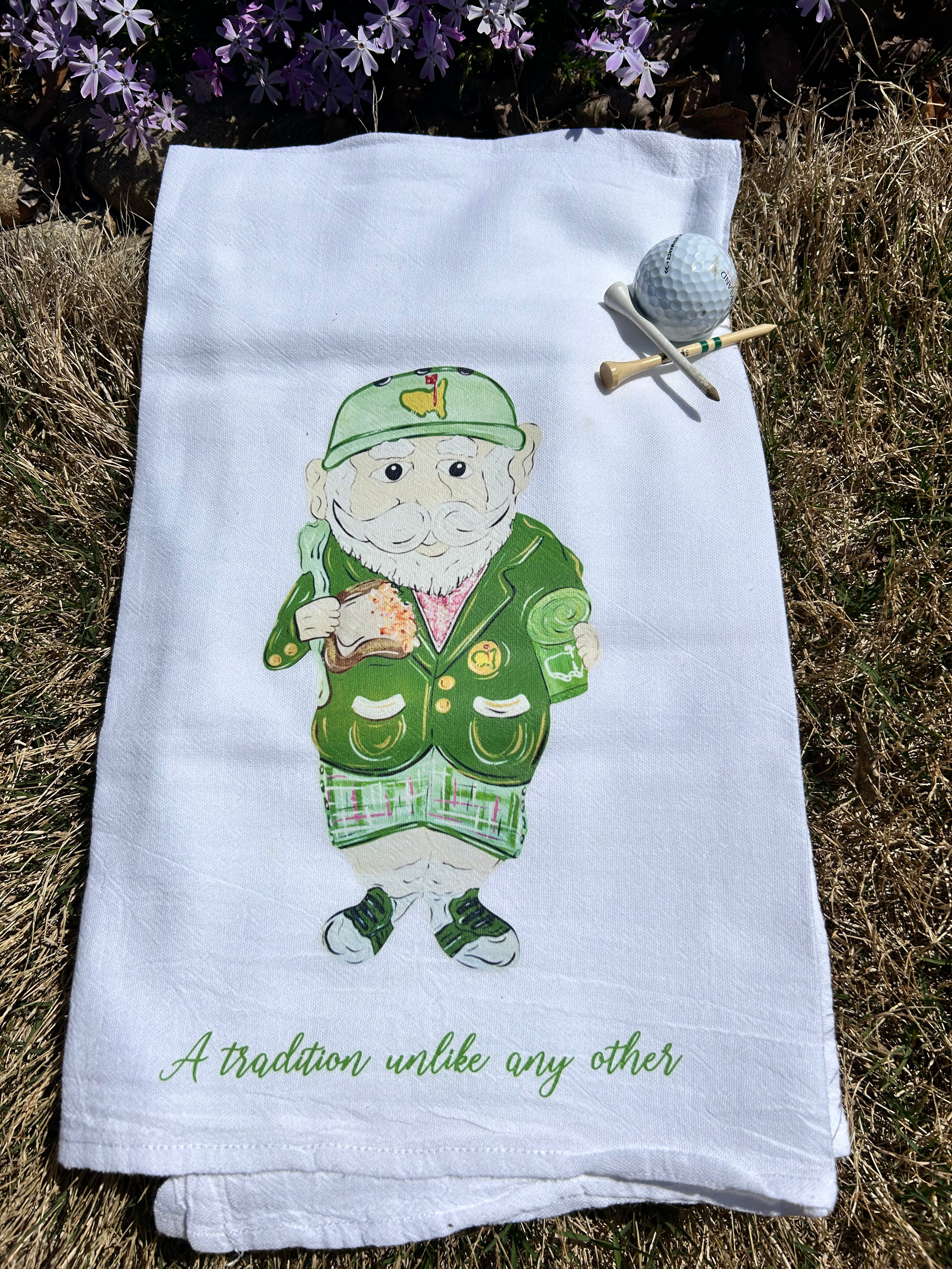 Add some playful charm to your home with this MASTER'S GOLF GNOME TEA TOWEL! This quirky tea towel features a golf gnome holding a pimento cheese sandwich and a cold beverage in his souvenir cup. Perfect for any golf enthusiast's home and makes a great hostess gift for a Master's party. (Fore real!)