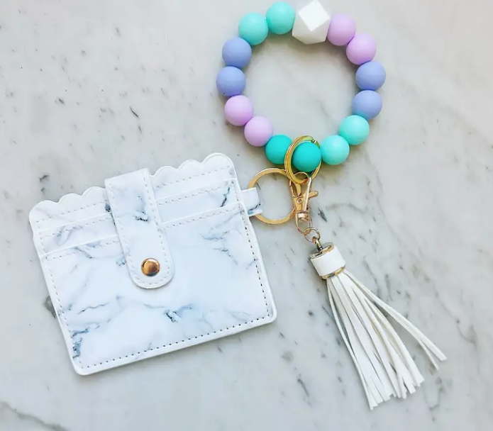 The wristband keyring is made with silicone beads, split ring, clasp, and leather tassel. The wristband keychain makes it easy for you to have your keys and wallet attached to your wristband, which easily slides onto your wrist!