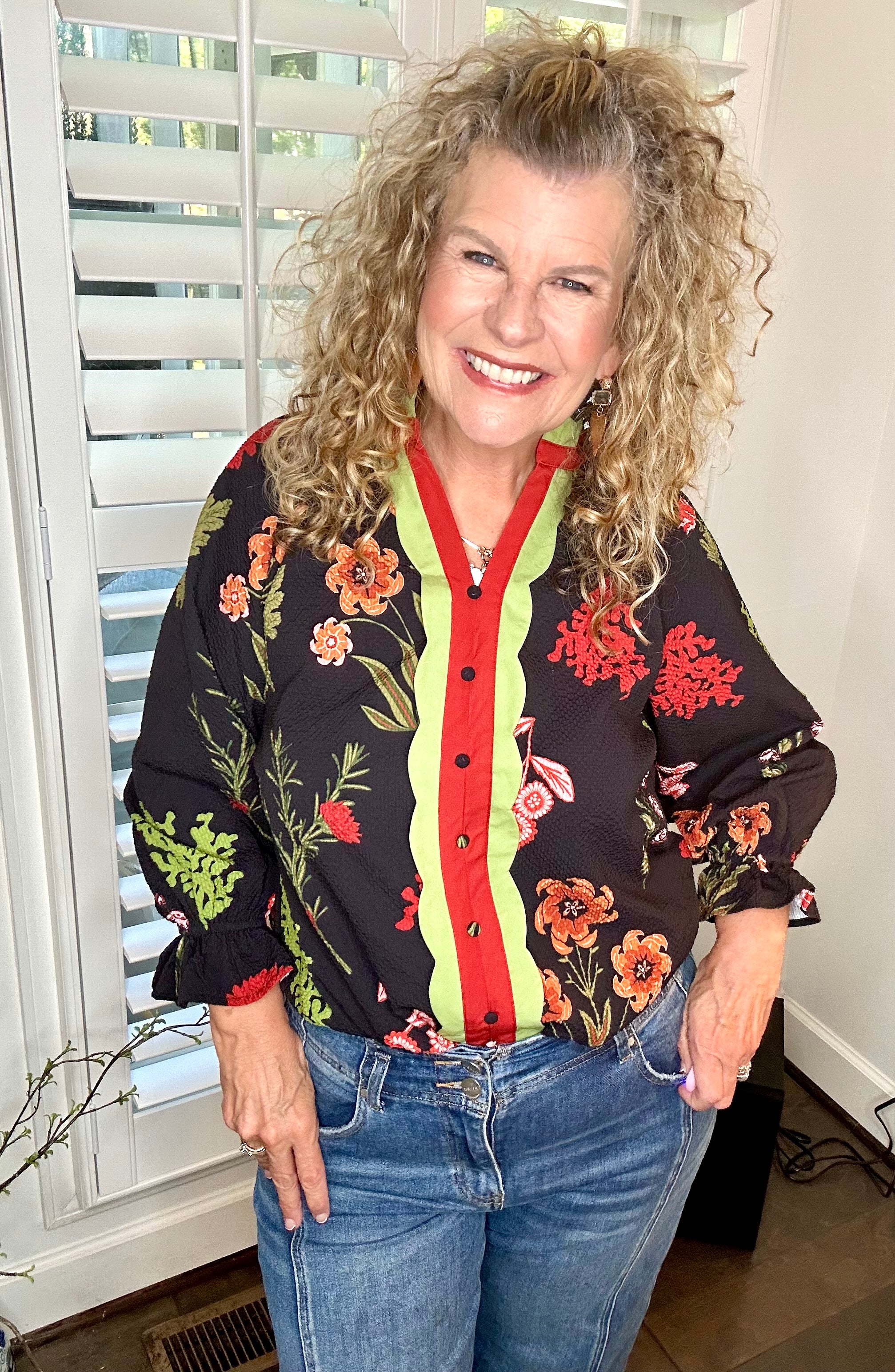 This playful mixed floral blouse features a charming button-front and a v-neck framed by a ruffle collar with contrast scalloped trim for an eye-catching detail. Long puff sleeves with elastic cuffs and a sweet tie add a whimsical touch, while the lightly gathered bodice creates a flattering, feminine shape perfect for any occasion.
