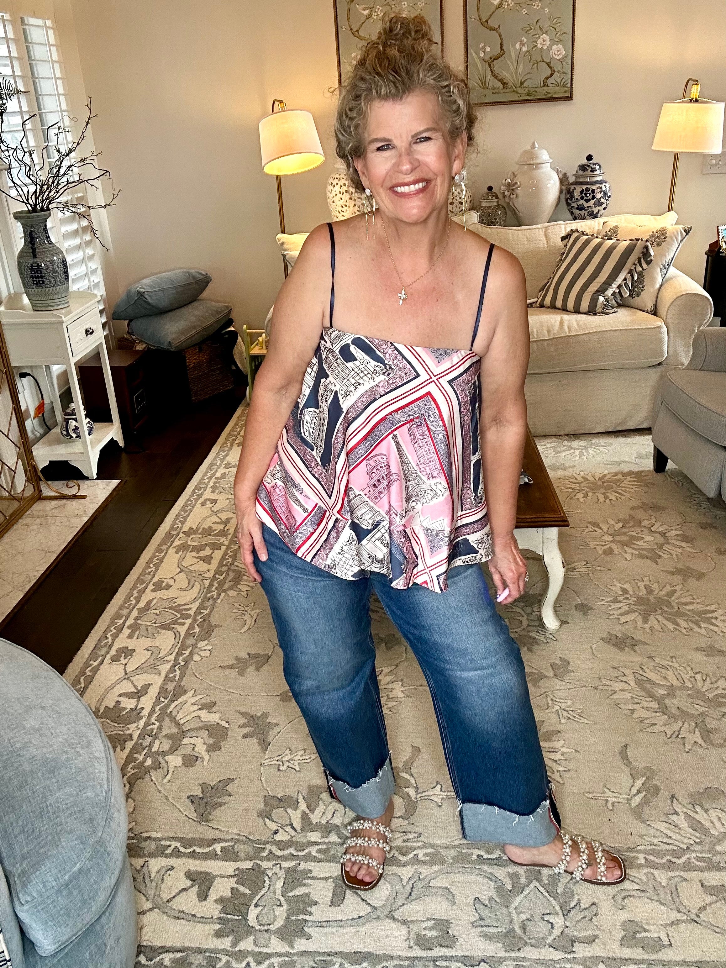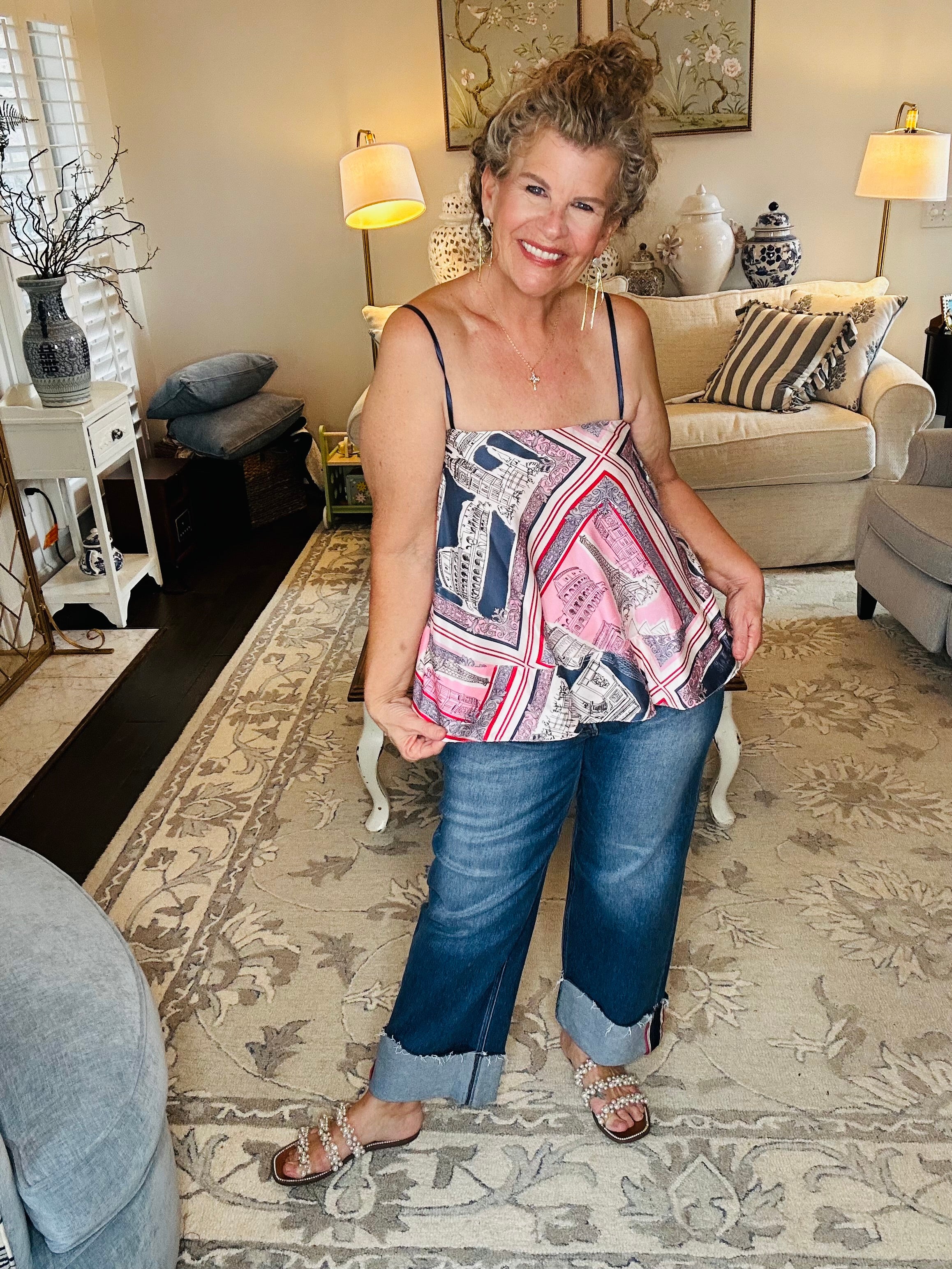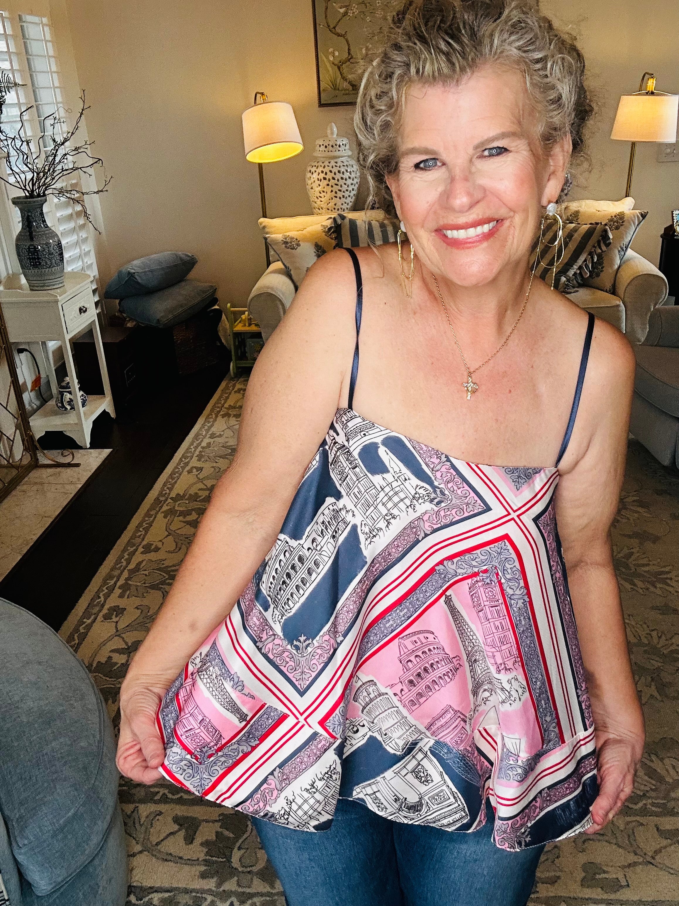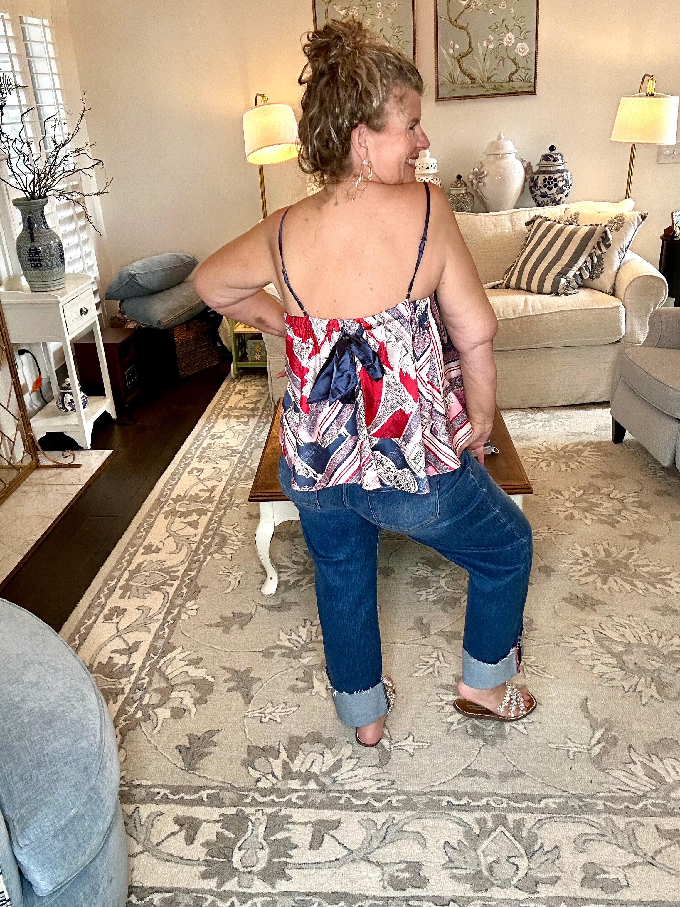 A statement set made for wandering. This back-tie flared top features a dreamy destination print with a soft, flowy shape that moves beautifully with every step. The adjustable tie-back adds a feminine finish while allowing for a flattering, customizable fit. —perfect for spring break strolls, brunch dates, or your next European daydream. ✨🤍