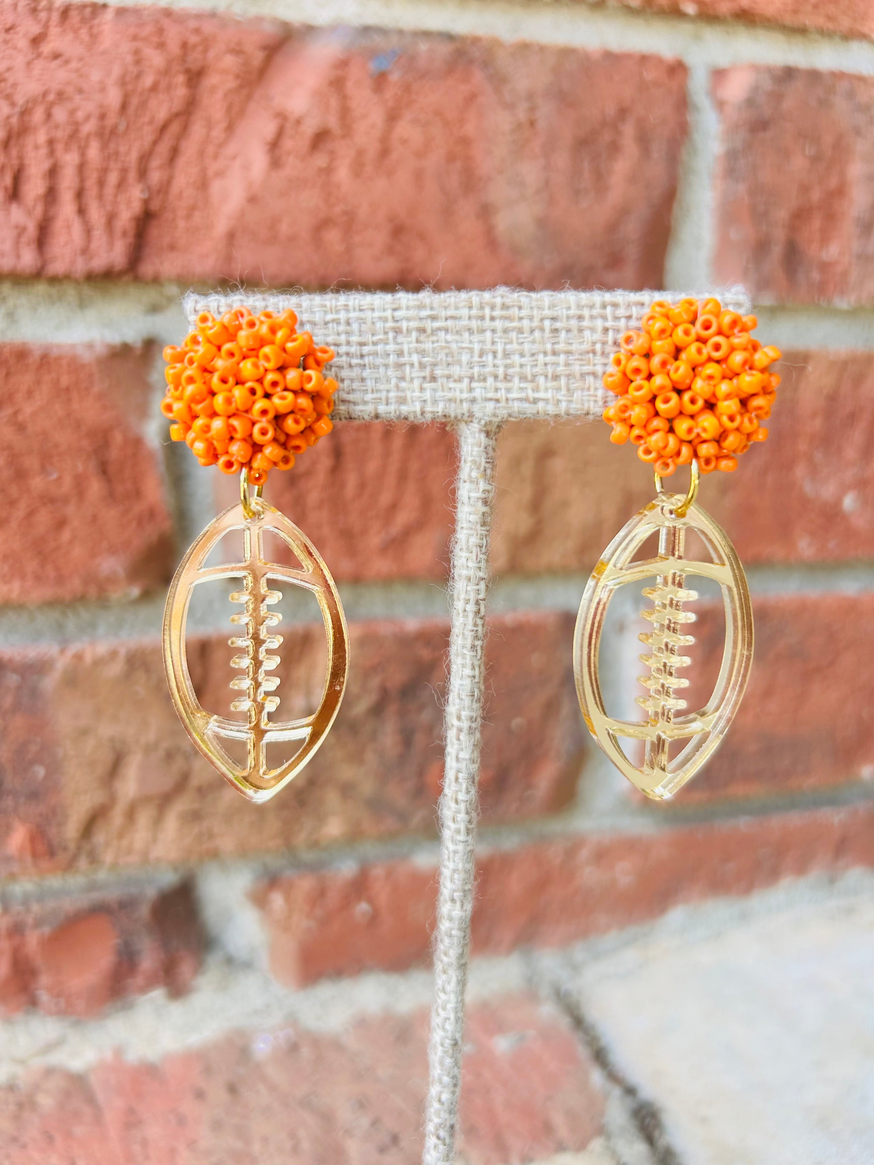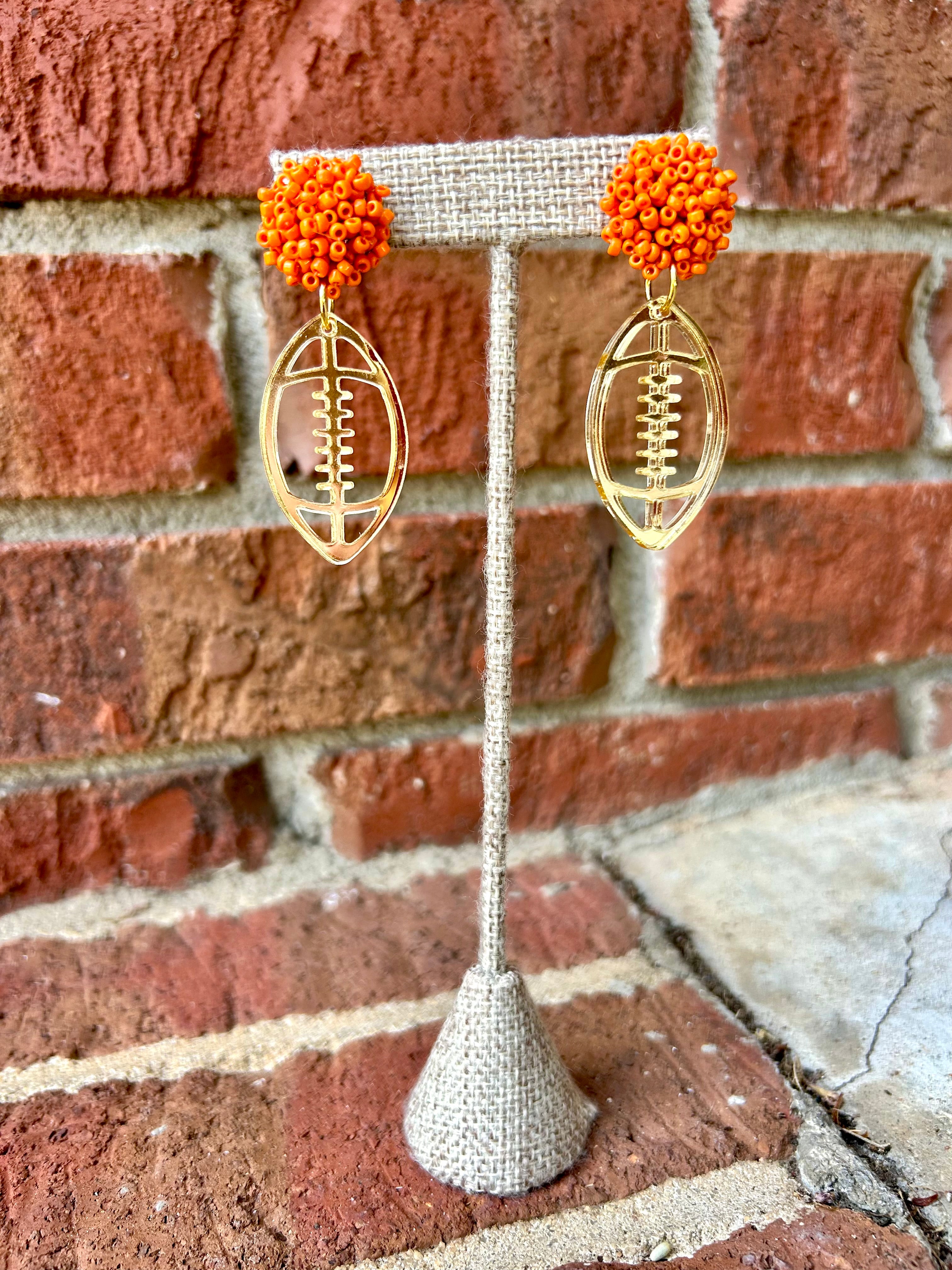 Add a pop of fun to your look with these small beaded football earrings. Lightweight and easy to wear, each earring features a playful cluster of bright orange beads at the top and an openwork football design below. Handmade with care in Greenville, SC, they’re perfect for showing off your sporty spirit with a touch of charm.