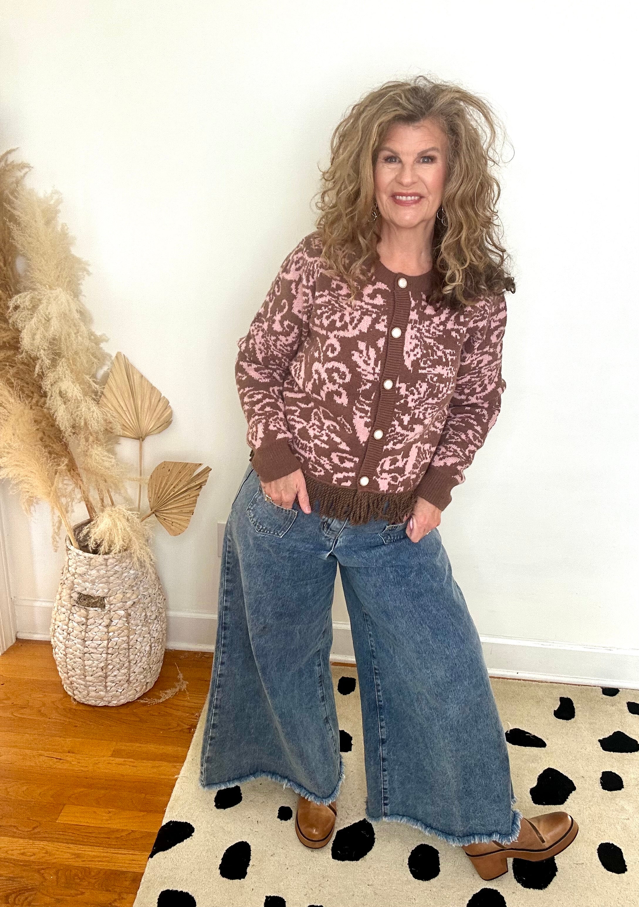 MOCHA PINK FLORAL KNIT FRINGED SWEATER CARDIGAN