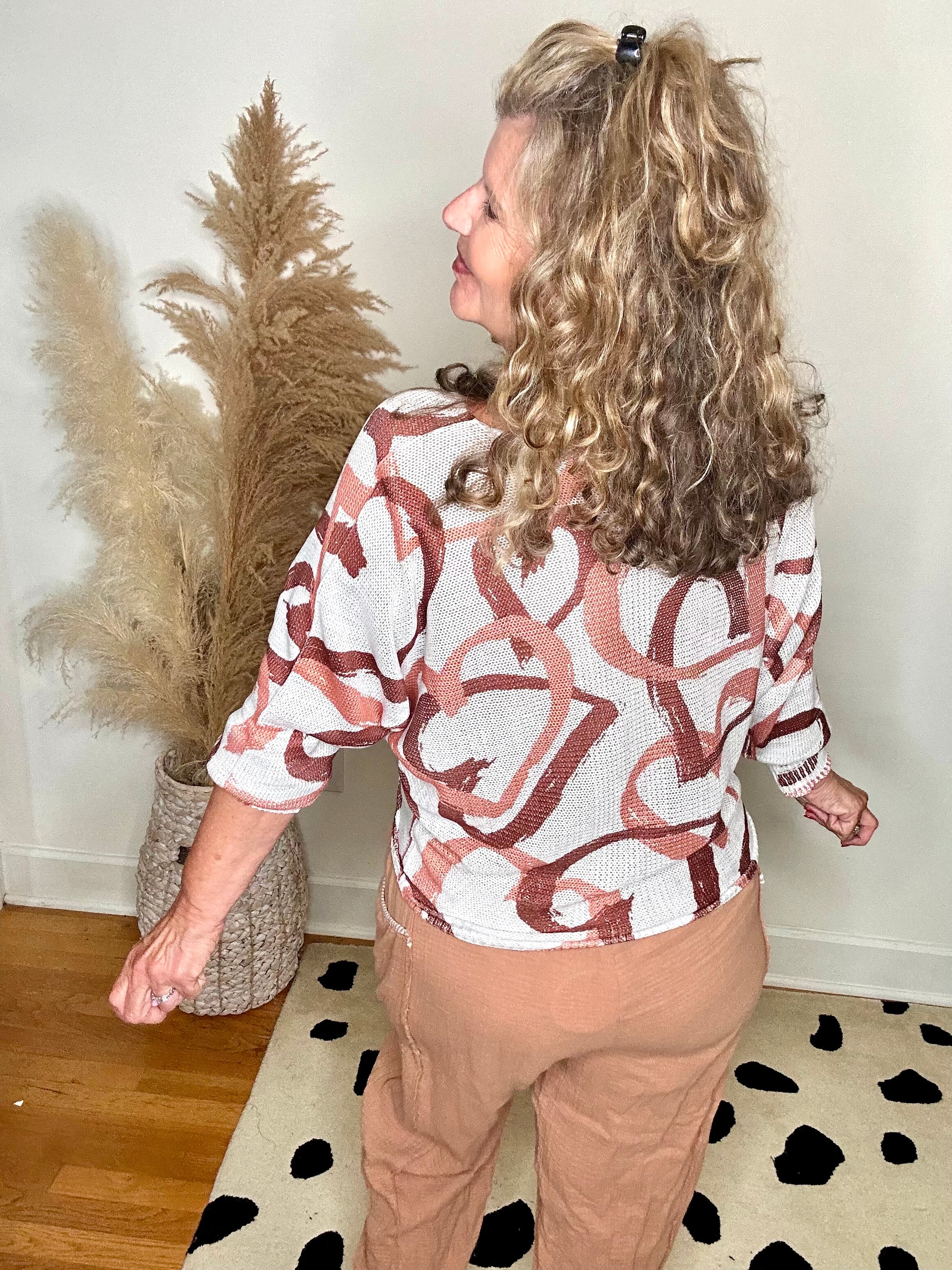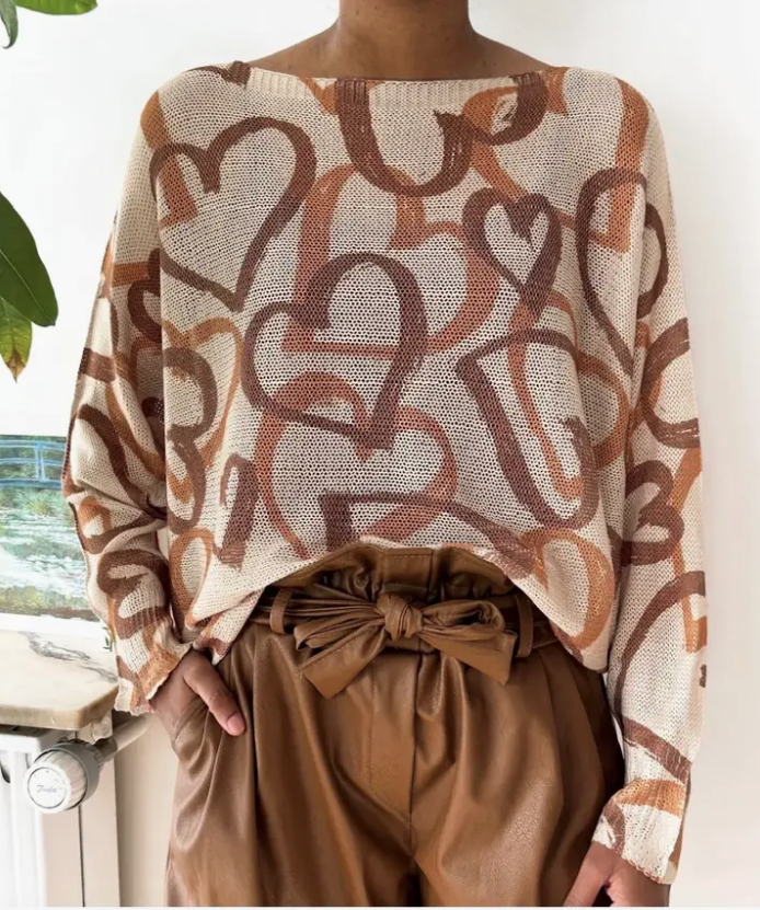 Cozy up in this cream sweater adorned with playful brown hearts, perfect for adding a touch of fun to your everyday look. Designed to comfortably fit sizes Small through Large, it’s an easy choice for a stylish, casual vibe.